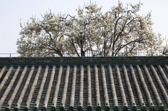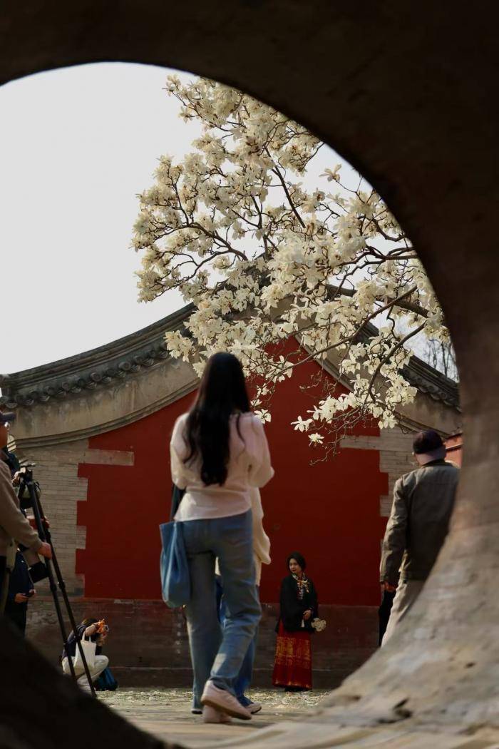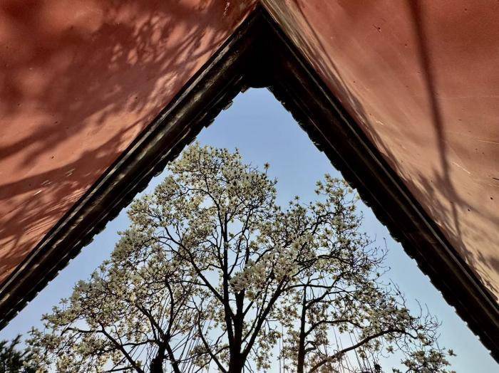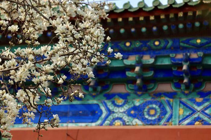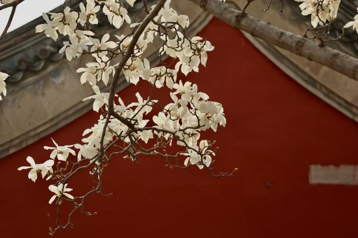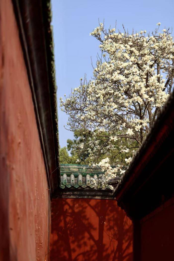 近日,斋宫内玉兰轮换通达,满树似锦如雪似云,枝条舒展间,将古朴殿宇衬得愈发端淑。