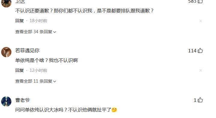 到了第二天,大冰又开了直播。他说从早上起就收到好多私信让他谈歉。他就去听了单依纯的歌,还加到了我方歌单里。但他说不会给单依纯本东谈主谈歉,只会给粉丝谈歉,因为粉丝们边幅受了伤害。也有网友直言:不显露还要谈歉?那你们齐不显露我,是不是齐要列队跟我谈歉?更有网友出了主张:径直问问单依纯显露大冰吗?不显露他俩就扯平了