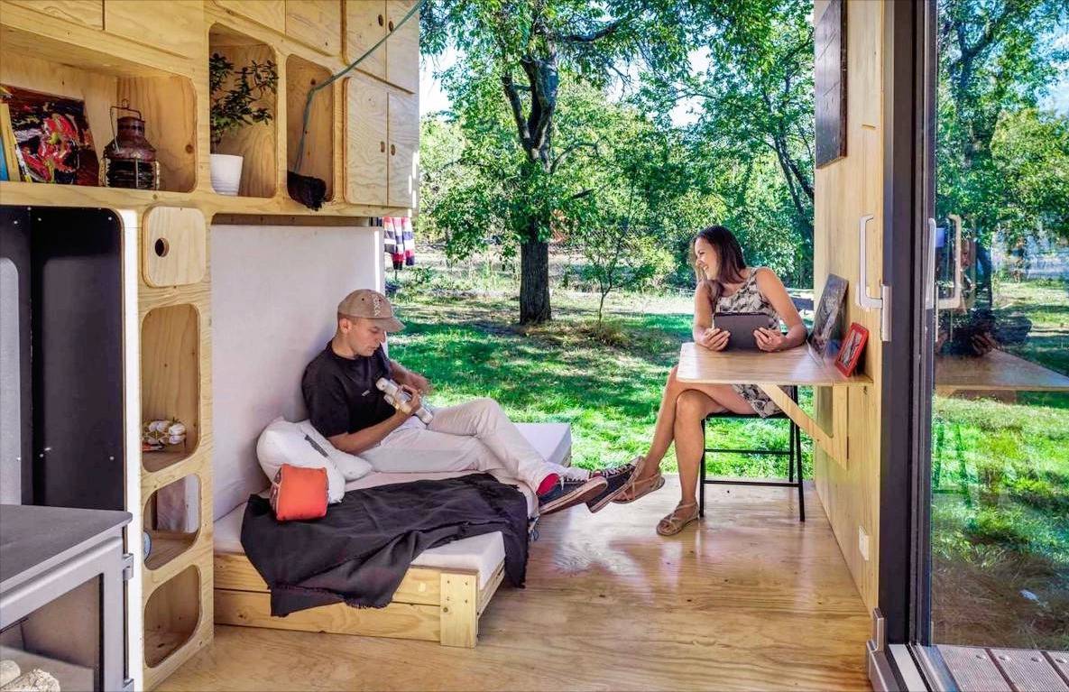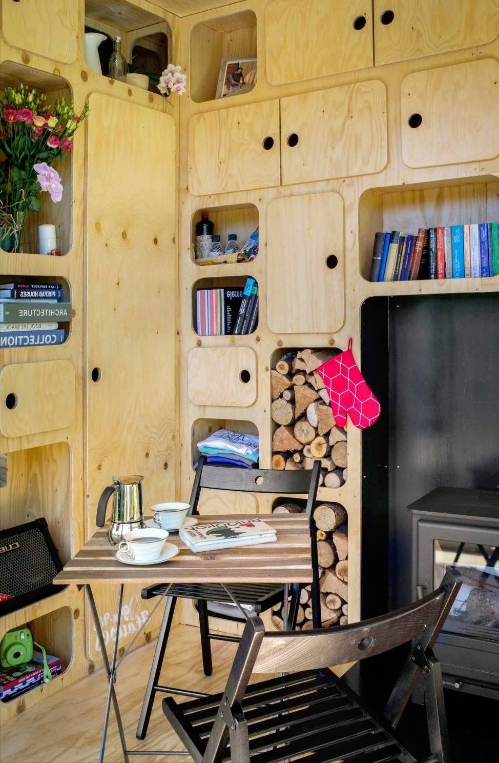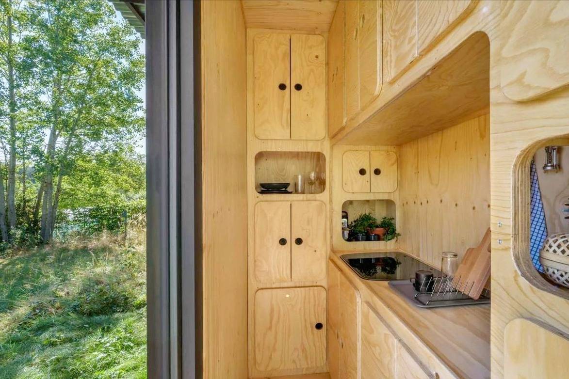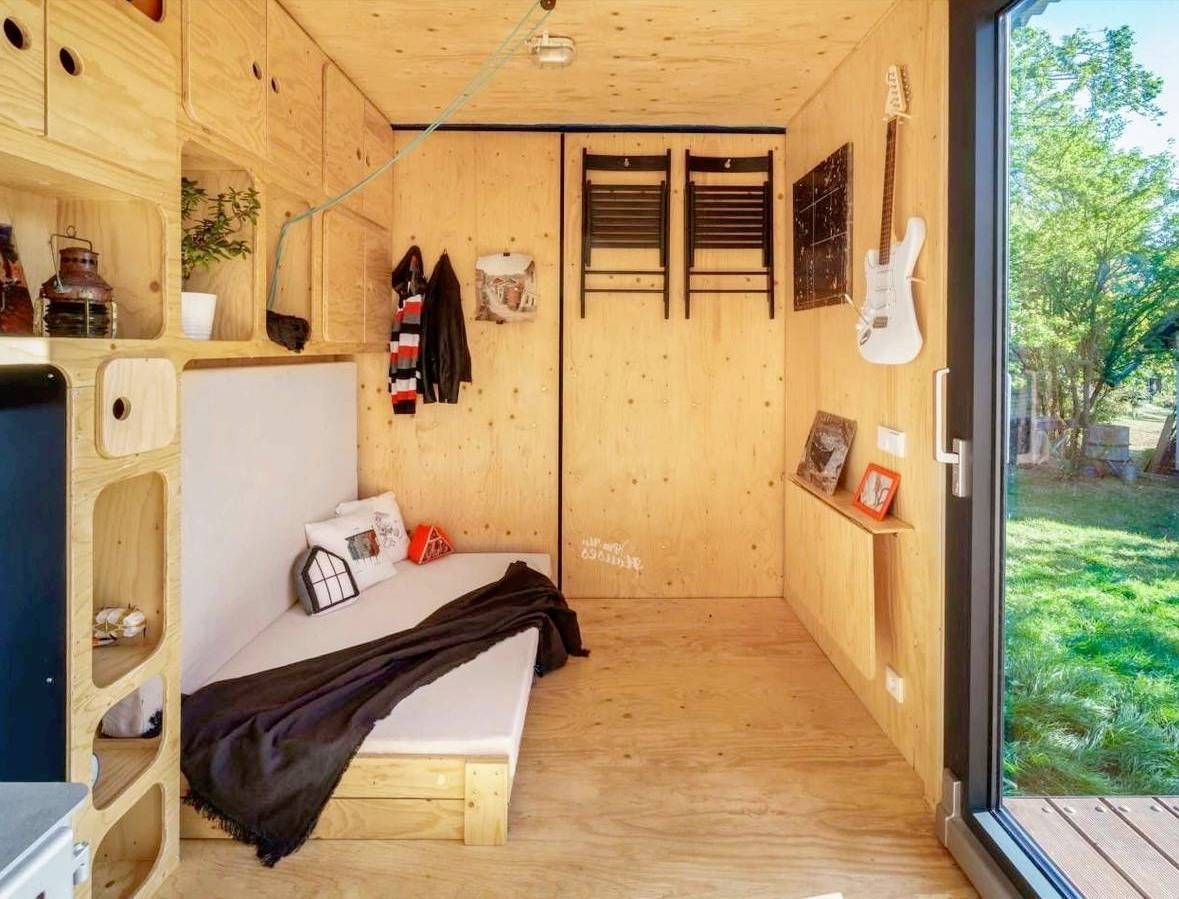 集装箱门的内侧经过纠正,并采用木质饰面进行遁入,完满了室内色调的谐和,营造出愈加温润的天然色调氛围。此外,门上还极端运筹帷幄了置物架,便于挂放衣物,进步了使用便利性。