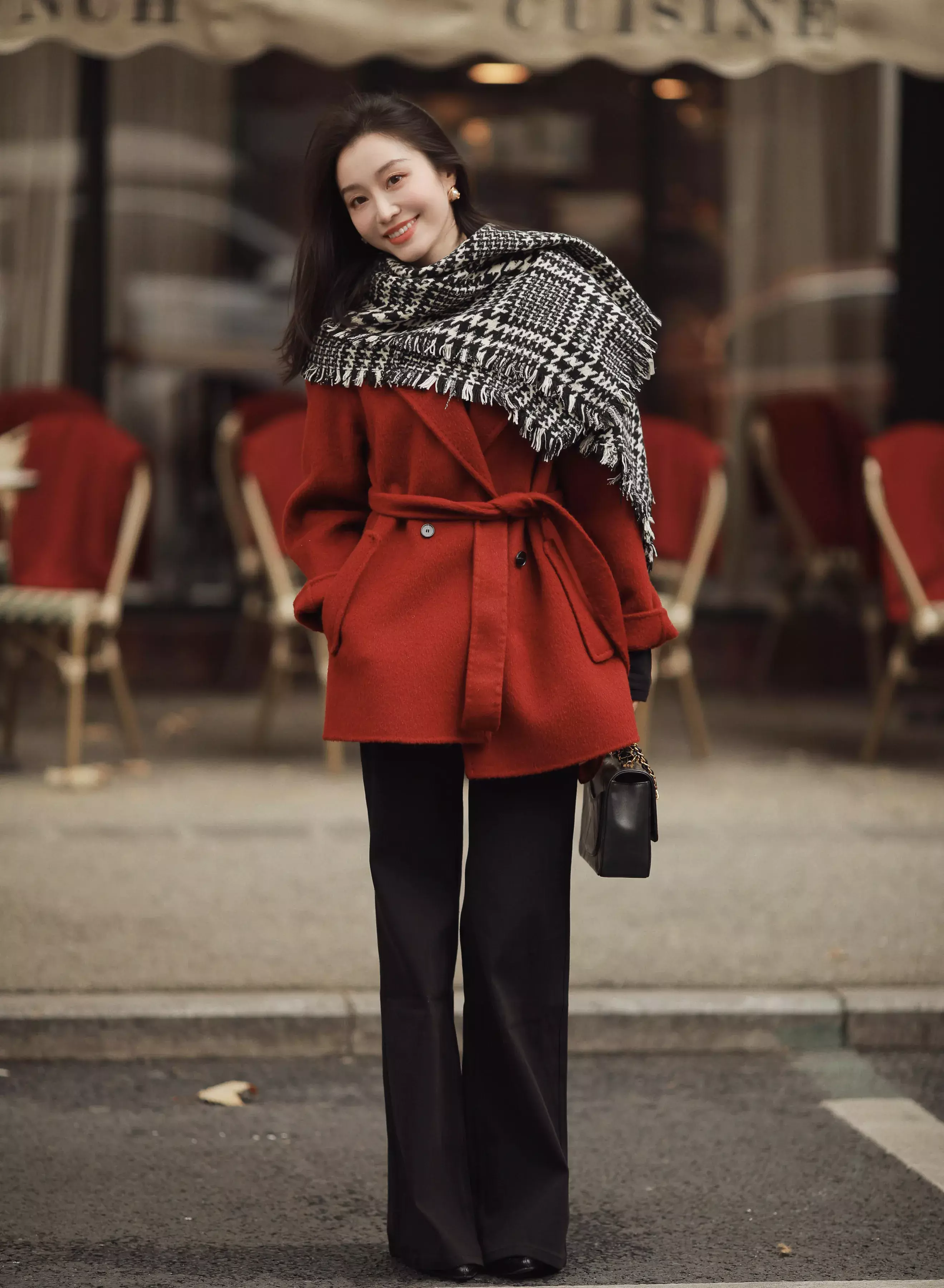 Tips③:红色大衣+玄色阔腿裤,经典复旧又喜庆