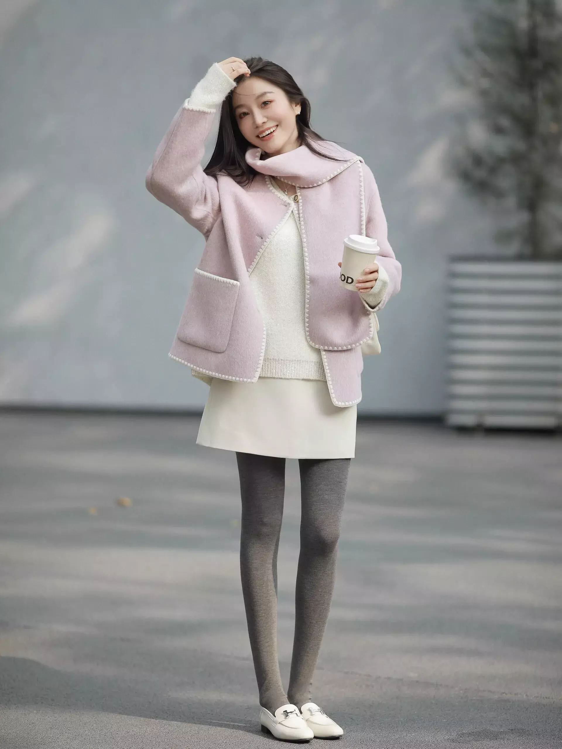 领有高挑纤瘦体魄的你,不错尝试用粉色的小香风技俩短大衣内搭白色毛衣和白色的短裙,再用一条灰色的御寒打底裤来组合。