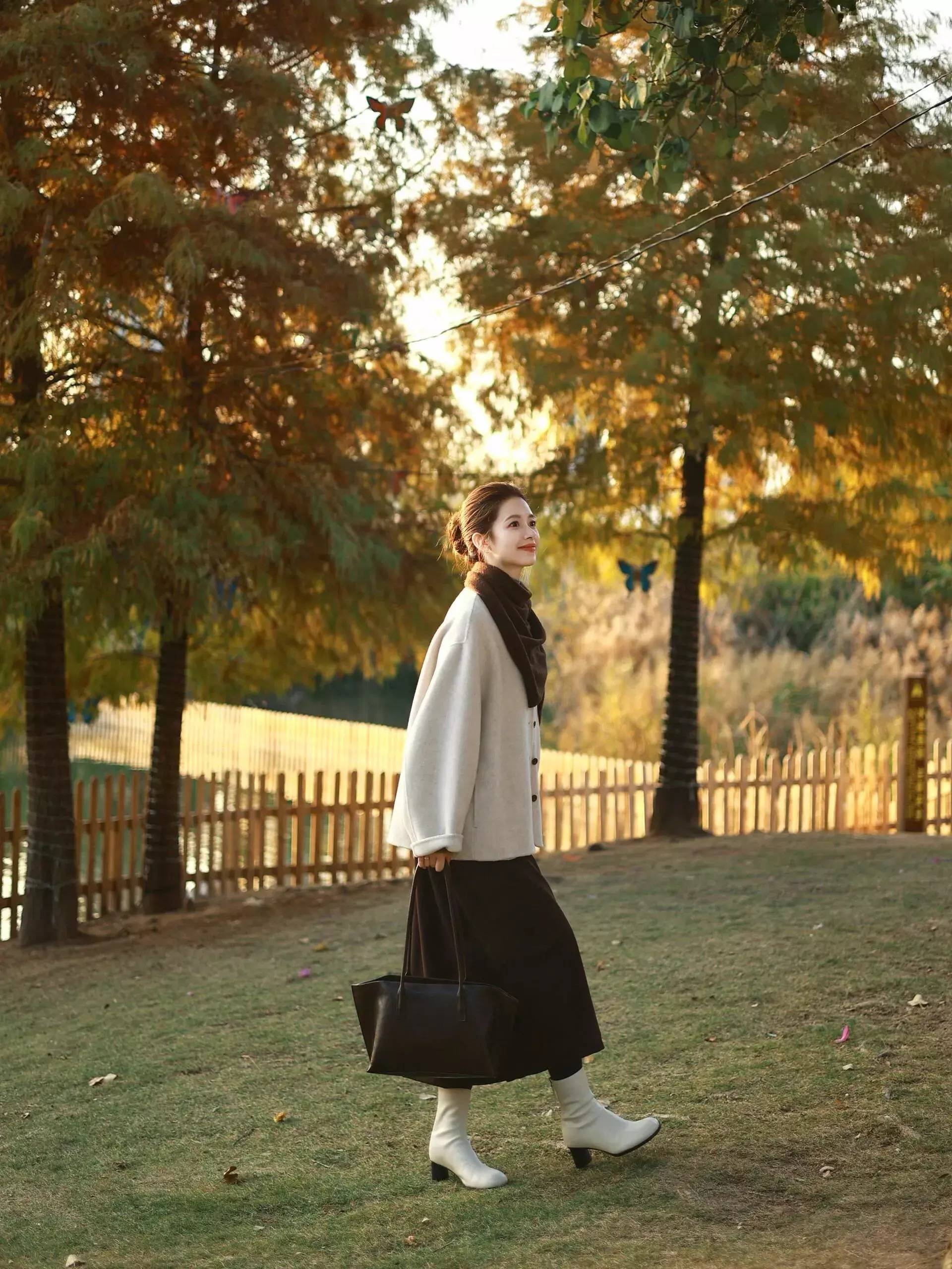 裙子是棕咖色,和脖子戴的领巾颜色酿成呼应,让举座配色更合作。而况它的整套穿搭配色莫得开始 3 个色调,战胜的三色行动。穿出来拦阻易出错,更不会固执无趣。