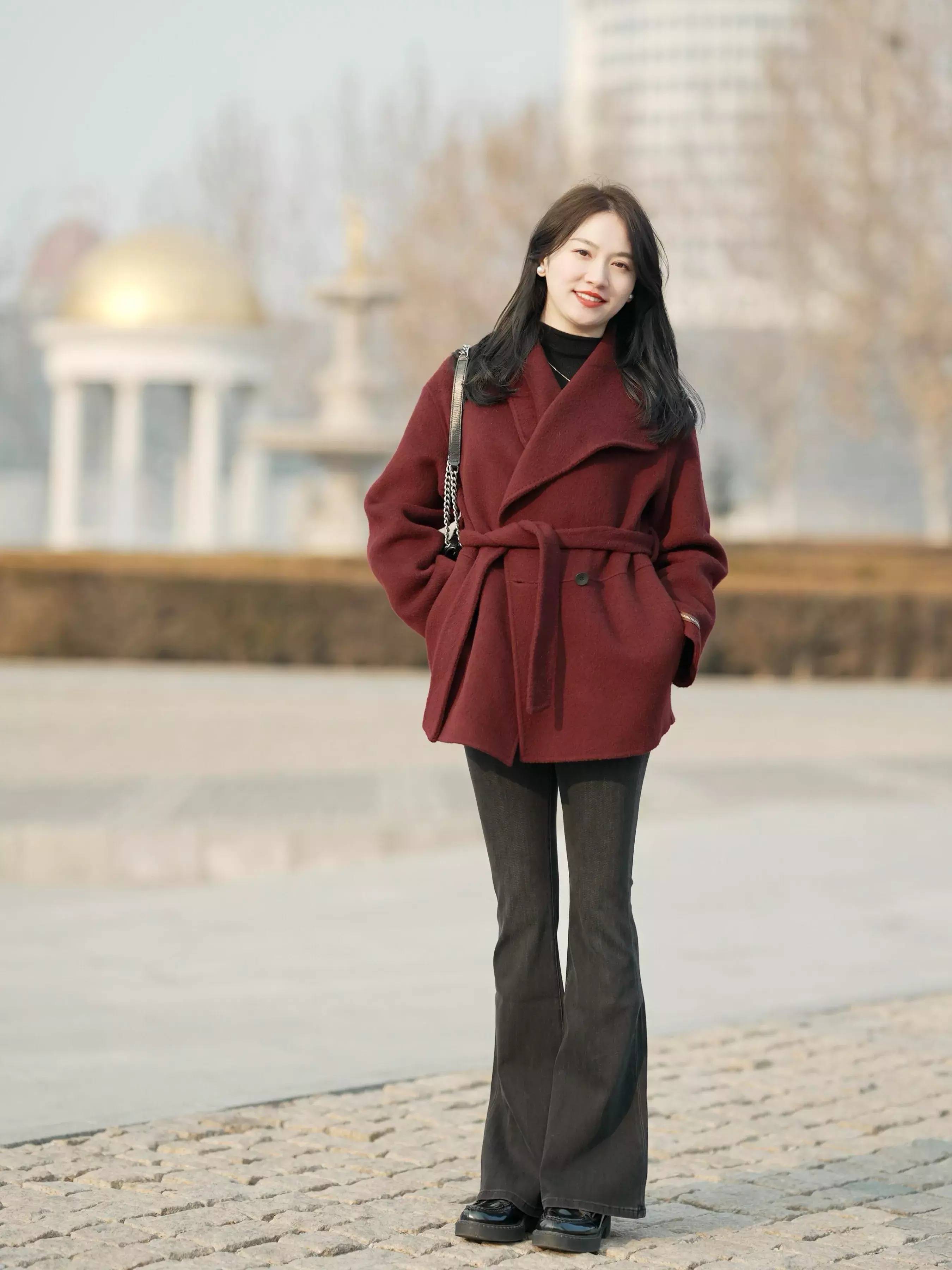 念念要造型更细巧的情况下,或者更御寒,我们不错把红色短大衣外衣腰带系起来,就能酿成高腰线,又能勒出小蛮腰。
