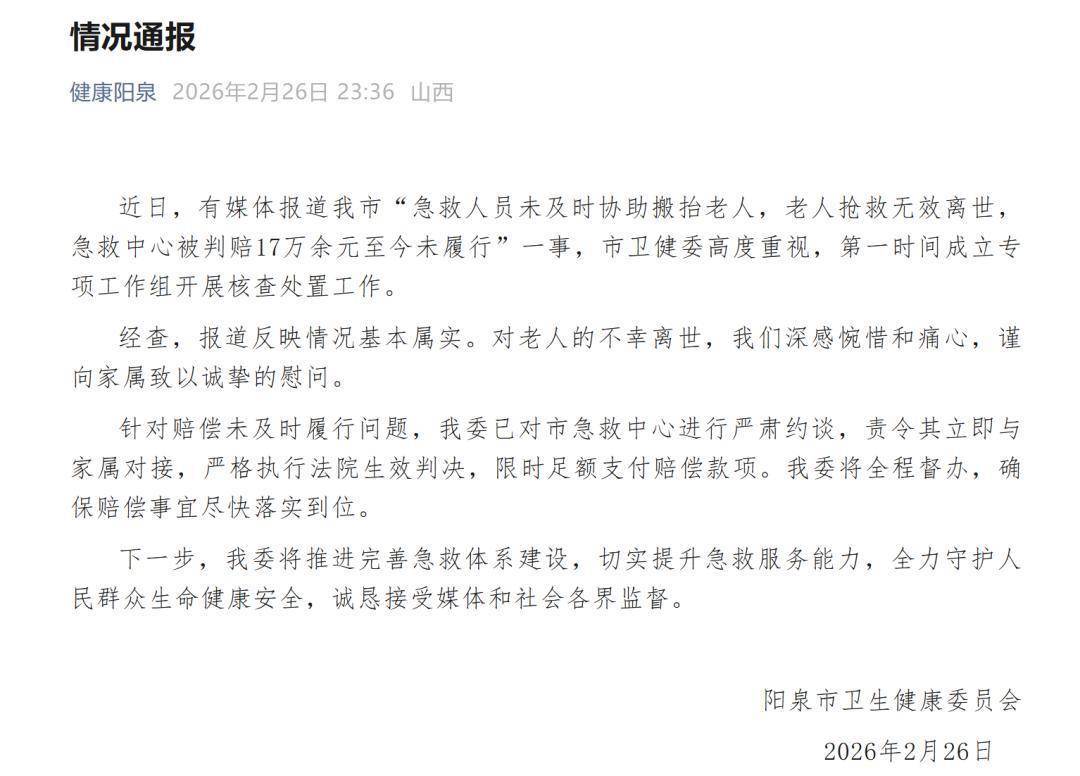 近日,有媒体报说念我市“急救东说念主员未实时协助搬抬老东说念主,老东说念主抢救无效离世,急救中心被判赔17万余元于今未履行”一事,市卫健委高度可爱,第一工夫树立专项责任组开展核查管制责任。