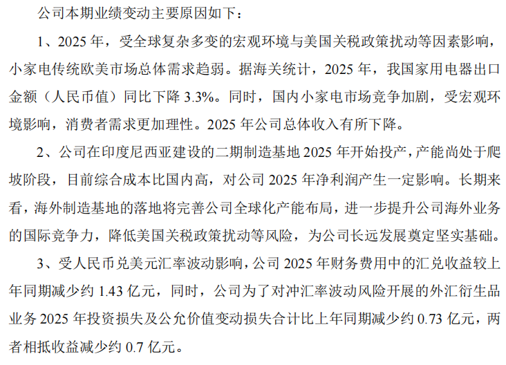 2026年3月2日新宝股份公布了2025年龄迹预报:营收161.9亿元同比下落3.74%开云体育,归母净利润10亿元同比下落4.85%;