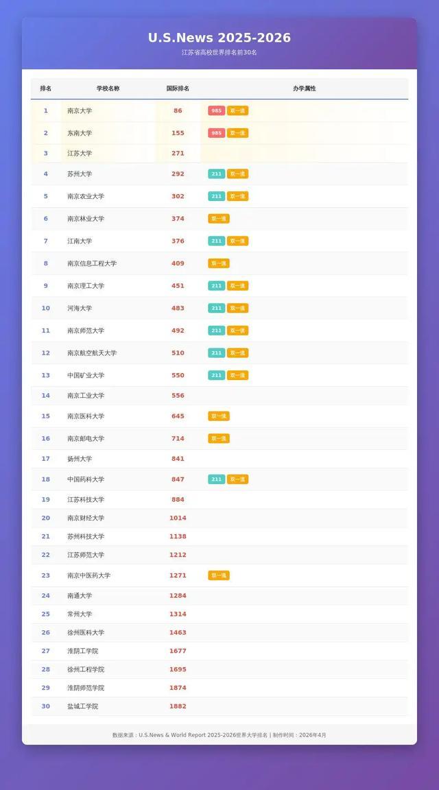 最近网崇高传一份好意思国大学排名,其中挑升列出江苏高校的排名。一眼看去,江苏这边照实淆乱,共有30所上榜学校,既有顶尖名校也有所在院校,举座实力在世界范围内齐处于前线。